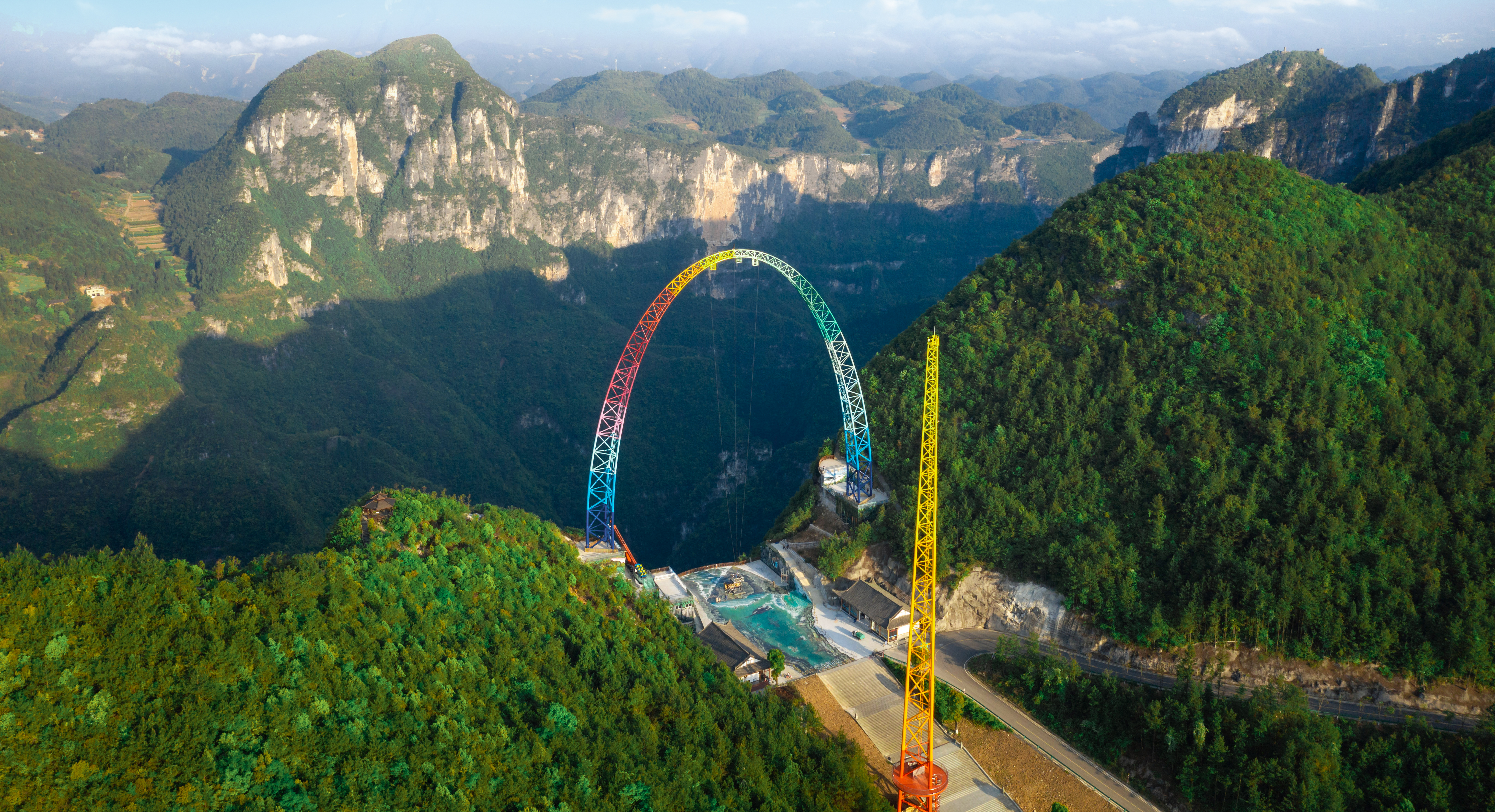 由中冶設(shè)備院自主研發(fā)、設(shè)計、制造、安裝的云端彩虹秋千,坐落于重慶龍缸5A景區(qū)700米的懸崖邊緣,主體由高100米、基礎(chǔ)跨距87.6米的彩虹涂裝拱形塔和高108米的提升發(fā)射塔等部分組成,該設(shè)備最大提升高度88m,最大運(yùn)行速度可達(dá)130km/h,以“世界最高的框架秋千”稱號被載入吉尼斯世界紀(jì)錄。